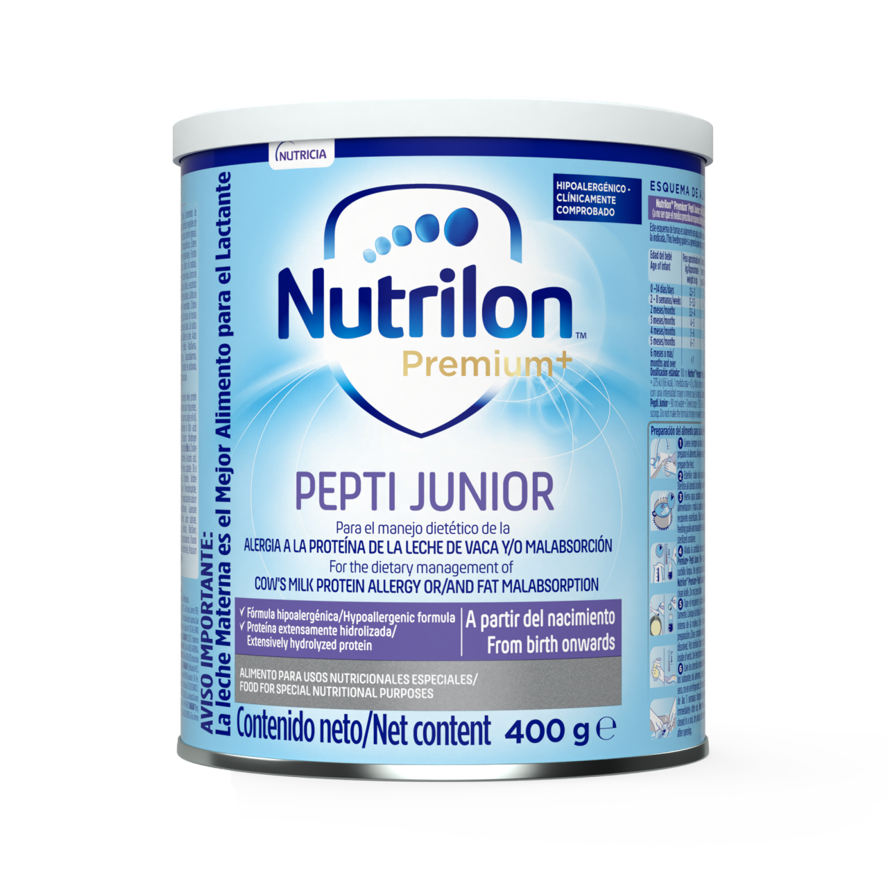 Nutrilon Premium+ Pepti Junior es una fórmula extensamente hidrolizada para bebés con alergia a la proteína de la leche de vaca (APLV), intolerancia alimentaria y malabsorción grave.