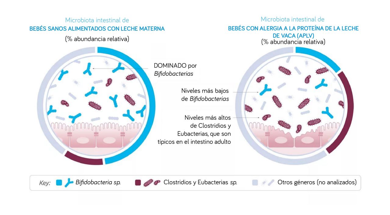 Los lactantes alérgicos a la proteína de la leche de vaca suelen presentar disbiosis intestinal, con un perfil alterado de microbios intestinales caracterizado por niveles mucho más bajos de bifidobacterias y niveles más altos de bacterias similares a las de los adultos.28,29