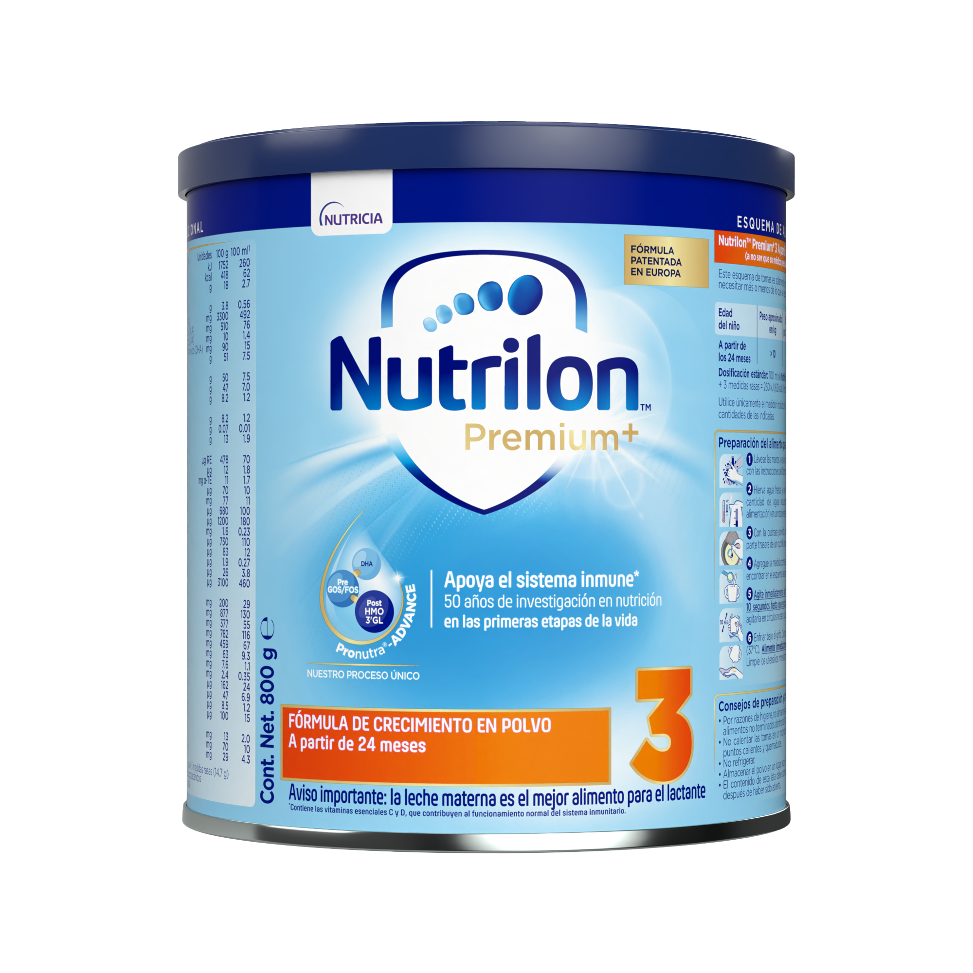 Lactosa (de leche), sólidos de leche descremada, aceites vegetales (aceite de colza, aceite de girasol alto oleico, aceite de girasol, aceite de coco), fibrasdietéticas (galactooligosacáridos (de leche), fructooligosacáridos), concentrado de proteína de suero de leche en polvo, leche entera sólida, fosfato de calcio dibásico, saborizante (aroma de vainilla), aceite de pescado, citrato tripotásico, cloruro de potasio, lecitina de soya (emulsionante), citrato de sodio, carbonato de magnesio, ácido ascórbico, citrato trisódico, fosfato tricálcico, cloruro de colina, sulfato de hierro, cloruro de magnesio, mioinositol, L-Carnitina, sulfato de zinc, D-pantotenato de calcio, carbonato de calcio, nicotinamida, acetato de DL-alfa tocoferil, palmitato de retinilo, DL-alfa tocoferol, gluconato de cobre, clorhidrato de piridoxina, fitomenadiona, riboflavina, clorhidrato de tiamina, ácido fólico, yoduro de potasio, biotina, selenito de sodio, colecalciferol, cianocobalamina.