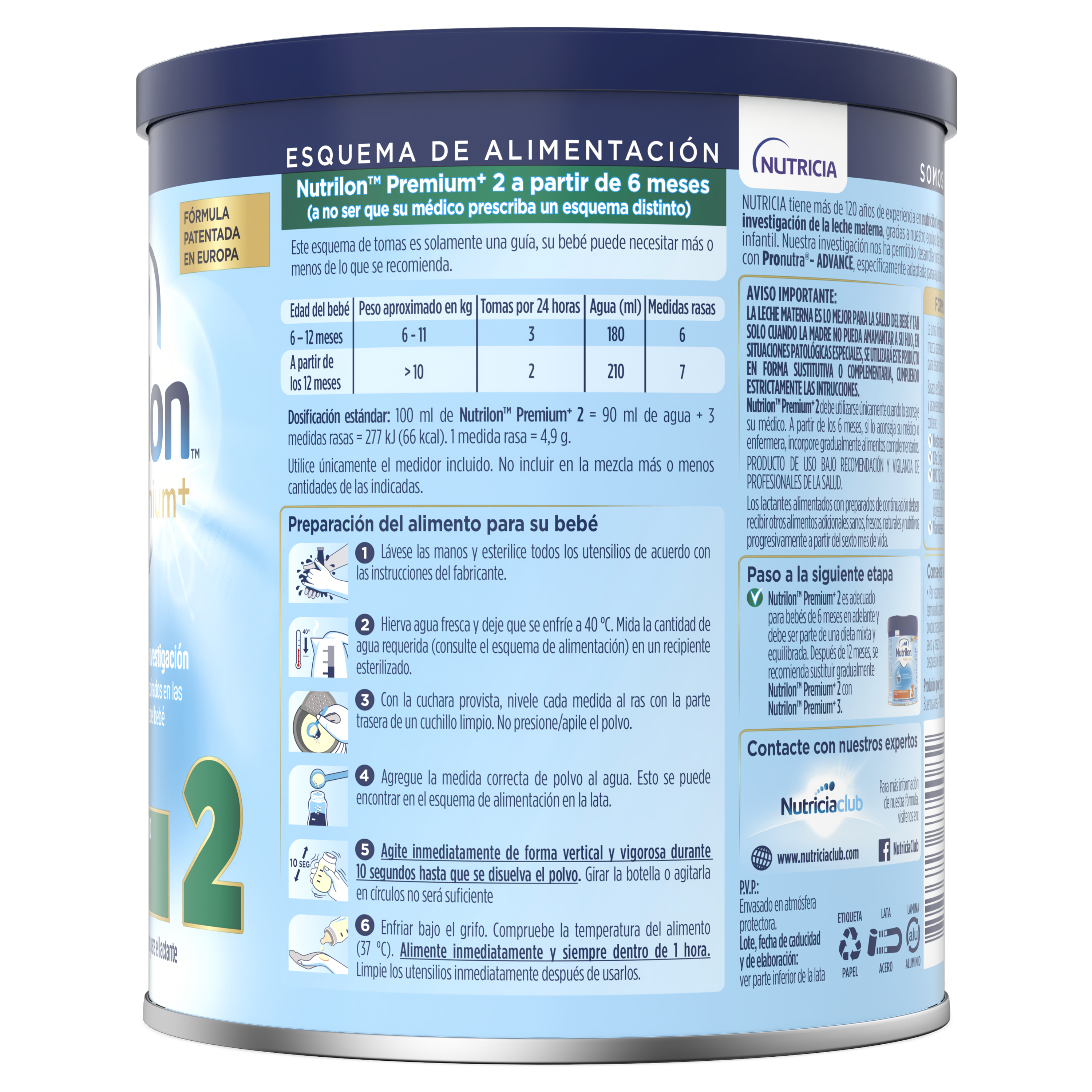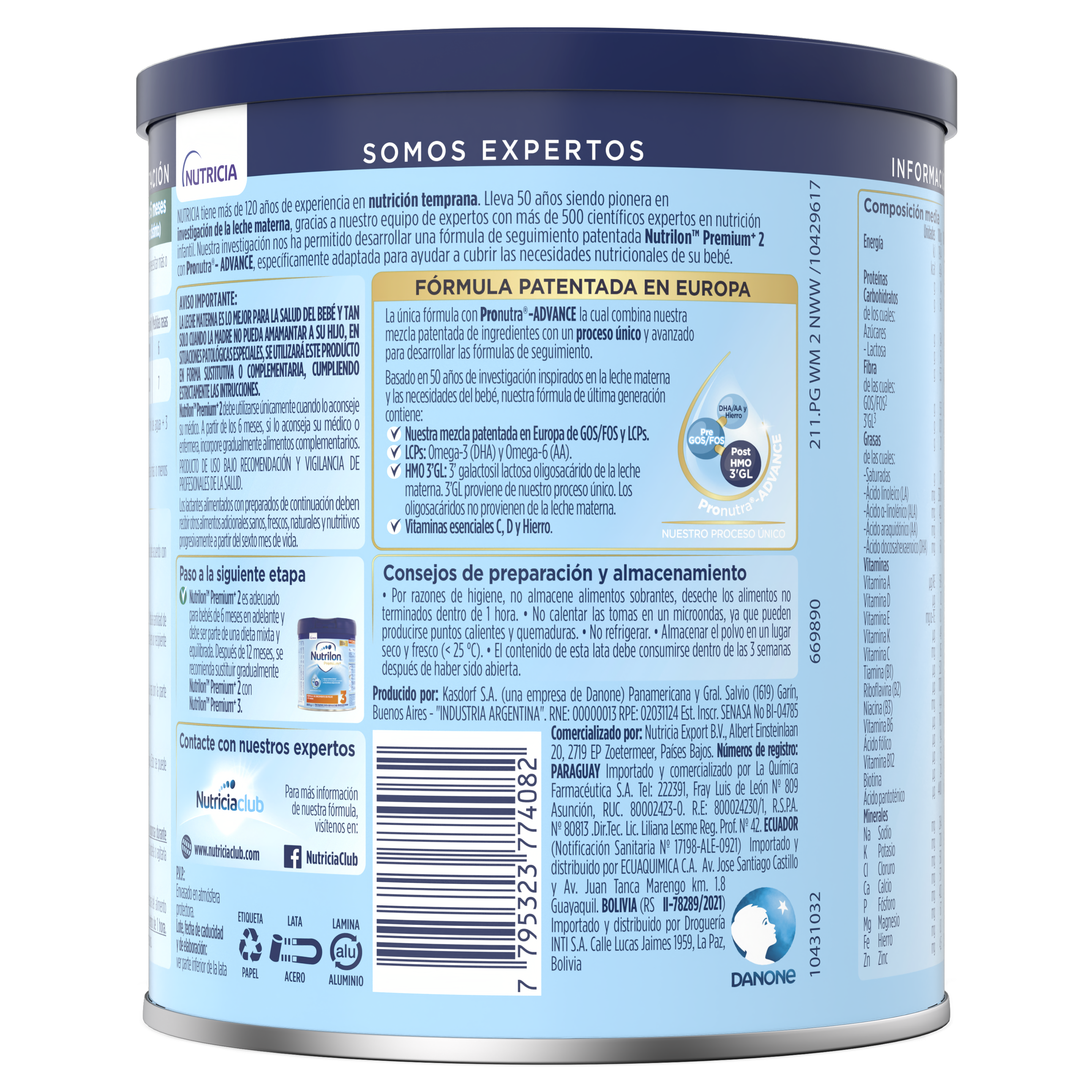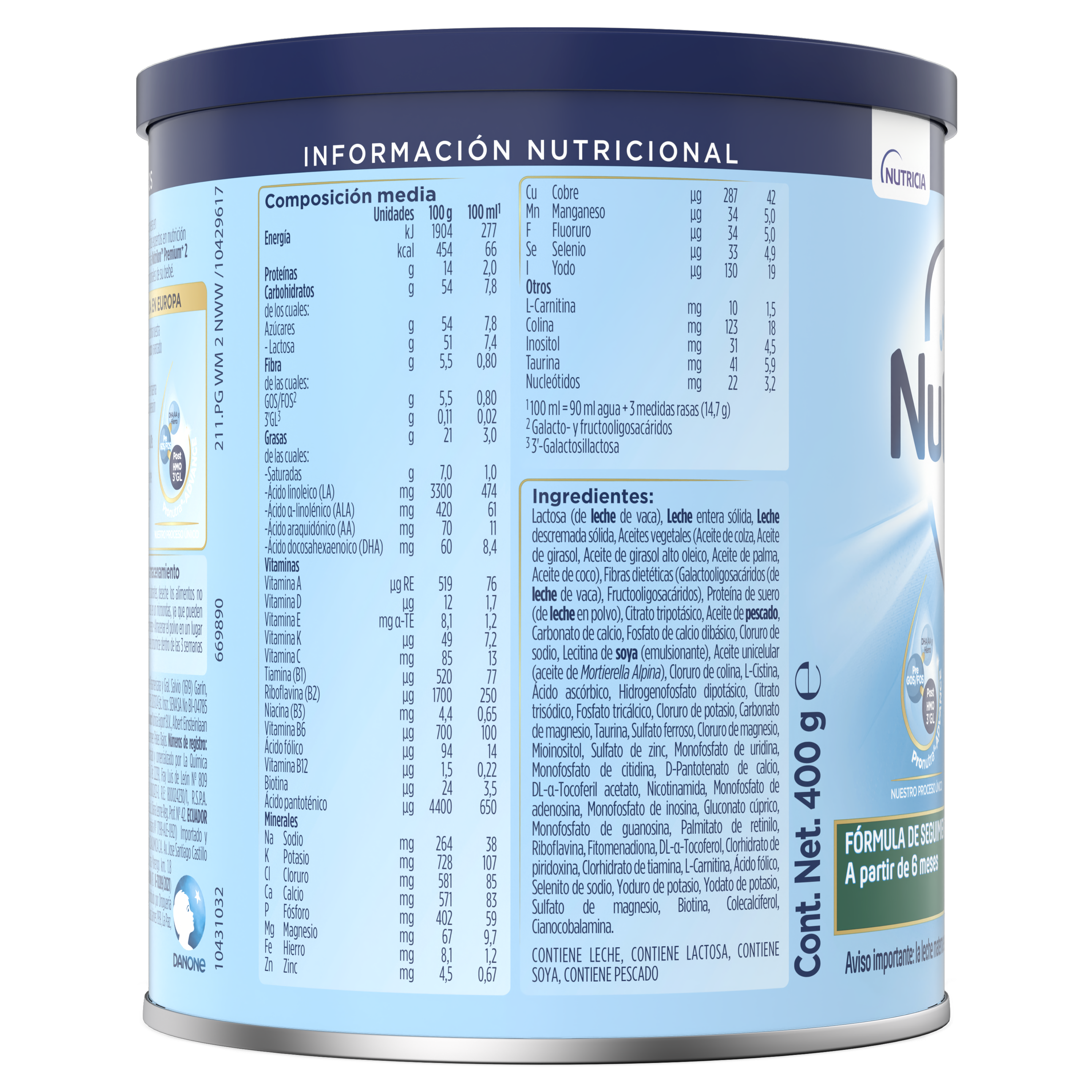 Lactosa (de leche de vaca), Leche entera sólida, Leche descremada sólida, Aceites vegetales (Aceite de colza, Aceite de girasol, Aceite de girasol alto oleico, Aceite de palma, Aceite de coco), Fibras dietéticas (Galactooligosacáridos (de leche de vaca), Fructooligosacáridos), Proteína de suero (de leche en polvo), Citrato tripotásico, aceite de pescado, Carbonato de calcio, Fosfato de calcio dibásico, Cloruro de sodio, Lecitina de soya (emulsionante), Aceite unicelular (aceite de Mortierella Alpina), Cloruro de colina, L-Cistina, Ácido ascórbico, Hidrogenofosfato dipotásico, Citrato trisódico, Fosfato tricálcico, Cloruro de potasio, Carbonato de magnesio, Taurina, Sulfato ferroso, Cloruro de magnesio, Mioinositol, Sulfato de zinc, Monofosfato de uridina, Monofosfato de citidina, D-Pantotenato de calcio, DL-alfa-Tocoferil acetato, Nicotinamida, Monofosfato de adenosina, Monofosfato de inosina, Gluconato cúprico, Monofosfato de guanosina, Palmitato de retinilo, Riboflavina, Fitomenadiona, DL-alfaTocoferol, Clorhidrato de piridoxina, Clorhidrato de tiamina, L-Carnitina, Ácido fólico, Selenito de sodio, Yoduro de potasio, Yodato de potasio, Sulfato de magnesio, Biotina, Colecalciferol, Cianocobalamina.