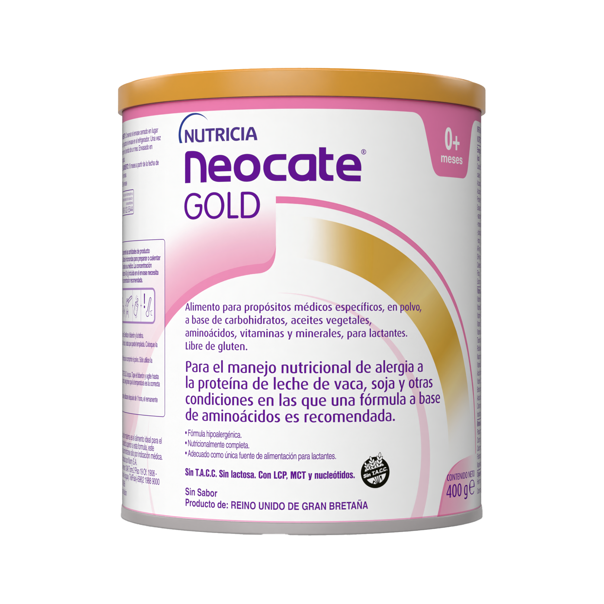 Jarabe de glucosa deshidratado, aceites vegetales refinados [triglicéridos de cadena media (aceite de semilla de palma y/o aceite de coco), aceite de girasol alto oleico, aceite de girasol, aceite de canola], L-Arginina, L-Aspartato, L-Leucina, L-Lisina acetato, L-Glutamina, L-Prolina, L-Valina, Glicina, L-Isoleucina, Fosfato de potasio, L-Treonina, L-Fenilalanina, L-Tirosina, L-Serina, Fosfato dibásico de calcio, L-Histidina, L-Alanina, Cloruro de sodio, Citrato tripotásico, Fosfato tricálcico, L-Cistina, Cloruro de magnesio, L-Tripófano, Carbonato de calcio, Citrato tricálcico, Glicesofosfato de calcio, Bitartrato de colina, L-Metionina, Aceite vegetal alto en ácido araquidónico de células simples, L-Aspartato de magnesio, Aceite vegetal alto en ácido decosahexanoico, M-Inositol, L-Ácido ascórbico, Taurina, Sulfato ferroso, Sulfato de zinc, L-Carnitina, Uridina 5'-monofosfato disódico, Citidina 5'-monofosfato, Nicotinamida, Inosina 5'-monofosfato disódico, Adenosina 5'-monofosfato, D-Pantotenato de calcio, Guanosina 5'-monofosfato disódico, Acetato de DL-alfa Tocoferil, Sufato de cobre, Clorohidrato de Tiamina, Clorohidrato de piroxina, Sulfato de Manganeso, Rivoflavina, Acetado de Vitamina A, Ioduro de Potasio, Ácido fólico, Cloruro de cromo, Vitamina K1, Selenito de Sodio, Molibdato de sodio, D-Biotina, Vitamina D3, Cianocobalamina, Emilsificante (INS472c), Antioxidantes (INS304, INS307, INS306).