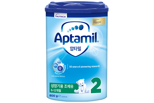 표준 투여량: 100 ml Aptamil® 2 프로누트라 어드밴스 = 90 ml 물 + 3 계량스푼 =67 kcal. 1 계량스푼 = 4.9 g.