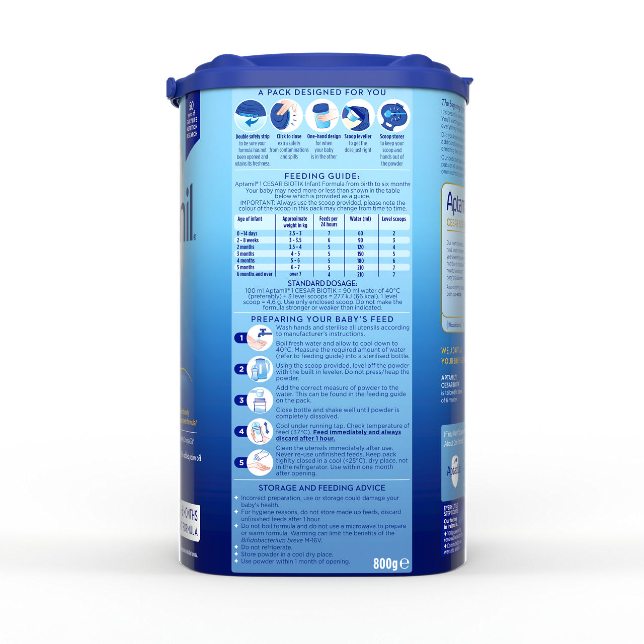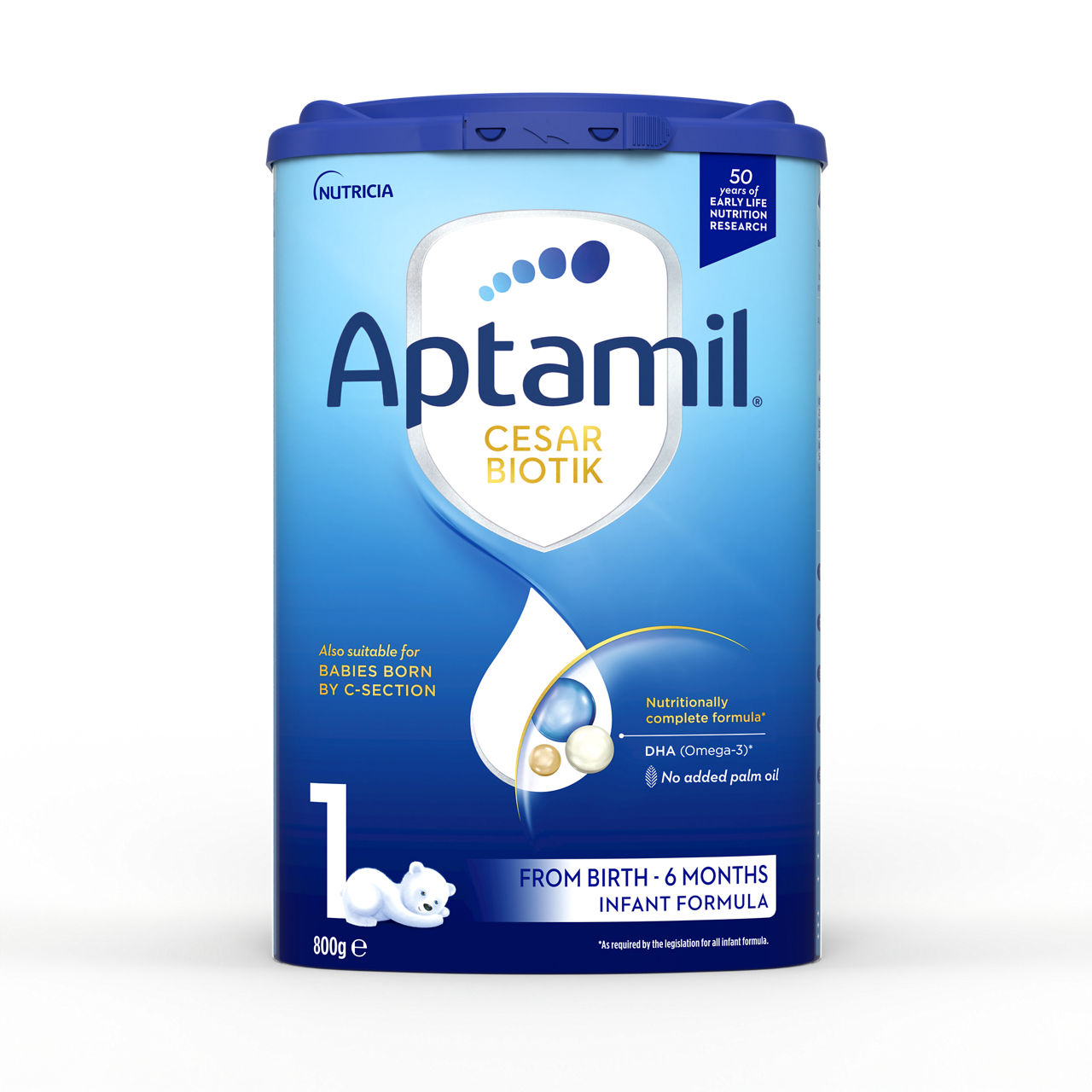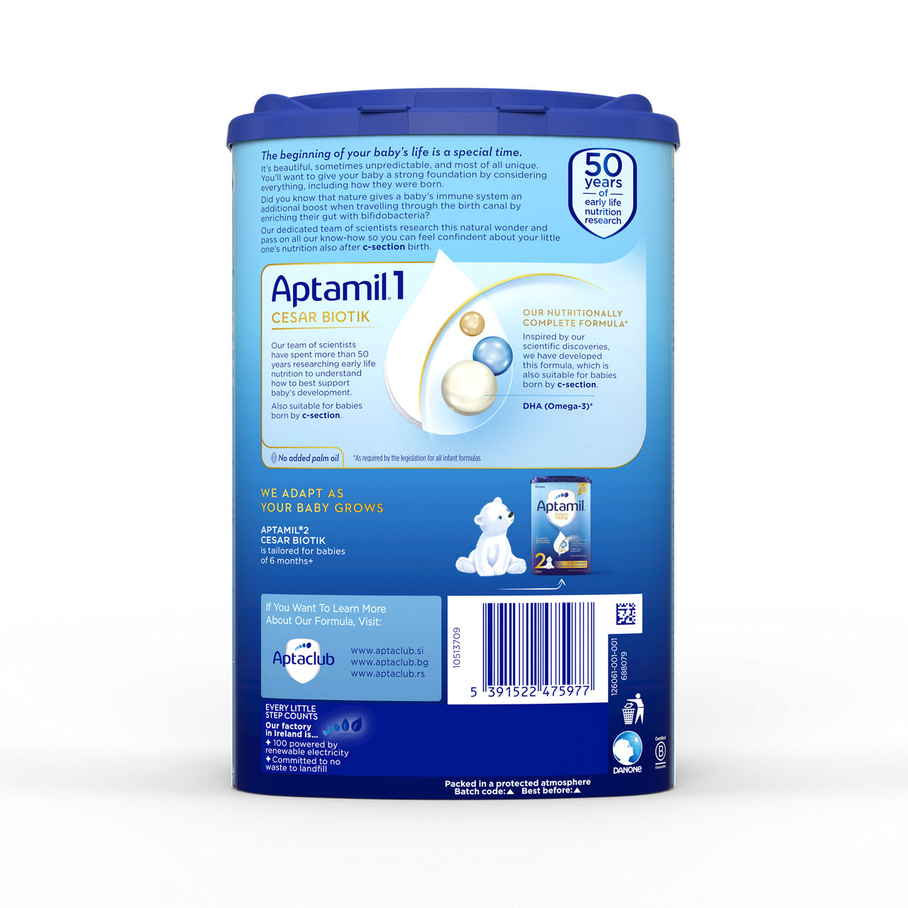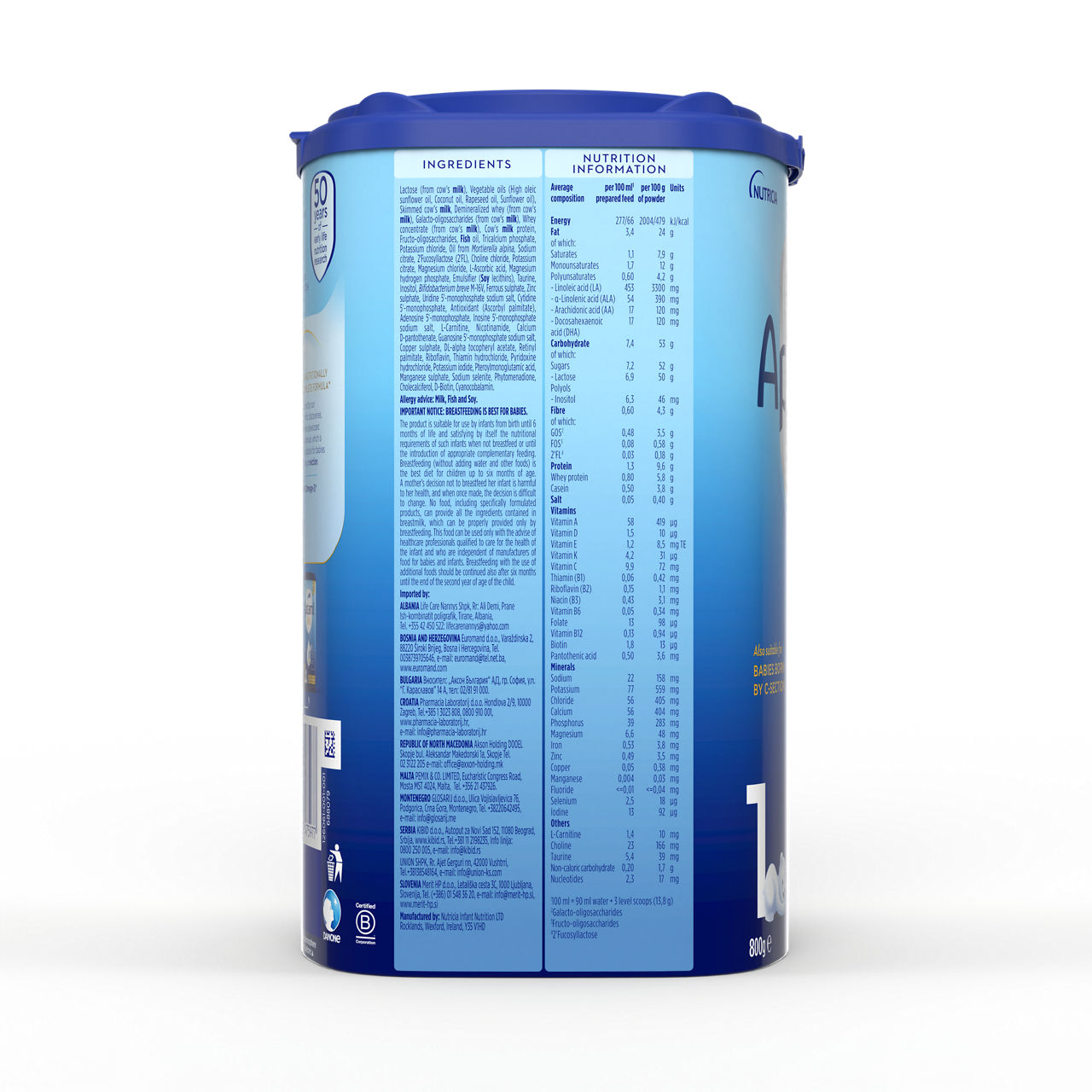 Sestavine: laktoza (iz mleka), rastlinska olja (ekstra sončnično, kokosovo, repično, sončnično olje), posneto mleko v prahu, demineralizirana sirotka (iz mleka), galaktooligosaharidi (iz mleka), koncentrat beljakovin sirotke (iz mleka), beljakovine kravjega mleka, fruktooligosaharidi, ribje olje, kalcijev fosfat, kalijev klorid, olje iz Mortierella alpina, natrijev citrat, 2'fukozillaktoza (2'FL), holin klorid, kalijev citrat, magnezijev klorid, L-askorbinska kislina, magnezijev hidrogen fosfat, emulgator:(sojin lecitin), tavrin, inozitol, Bifidobakterija breve M-16V, železov sulfat, cinkov sulfat,uridin-5'monofosfat natrijeva sol, citidin-5'-monofosfat, antioksidant (askorbil palmitat), adenozin-5'-monofosfat, inozin5'monofosfat natrijeva sol, L-karnitin, nikotinamid, kalcijev D-pantotenat, gvanozin 5'-monofosfat natrijeva sol, bakrov sulfat, DL-alfa tokoferil acetat, retinil palmitat, riboflavin, tiamin hidroklorid, piridoksin hidroklorid, kalijev jodid, pteroilmonoglutaminska kislina, manganov sulfat, natrijev selenit, fitomenadion, holekalciferol, D-biotin, cianokobalamin. Alergeni: mleko, ribe, soja.