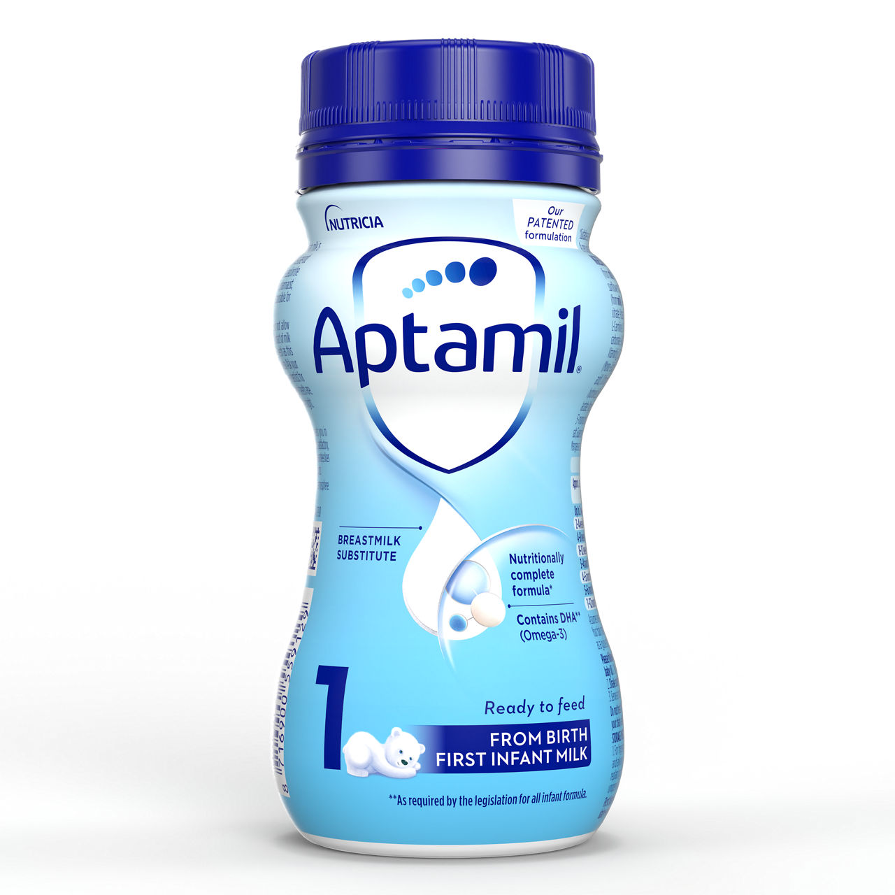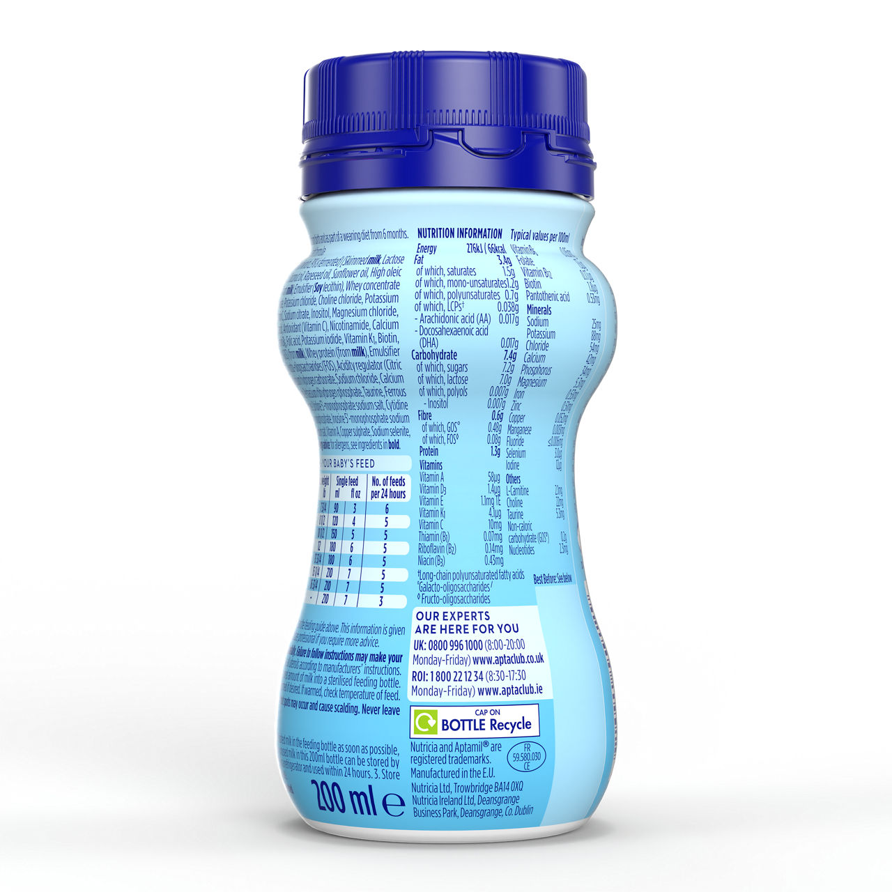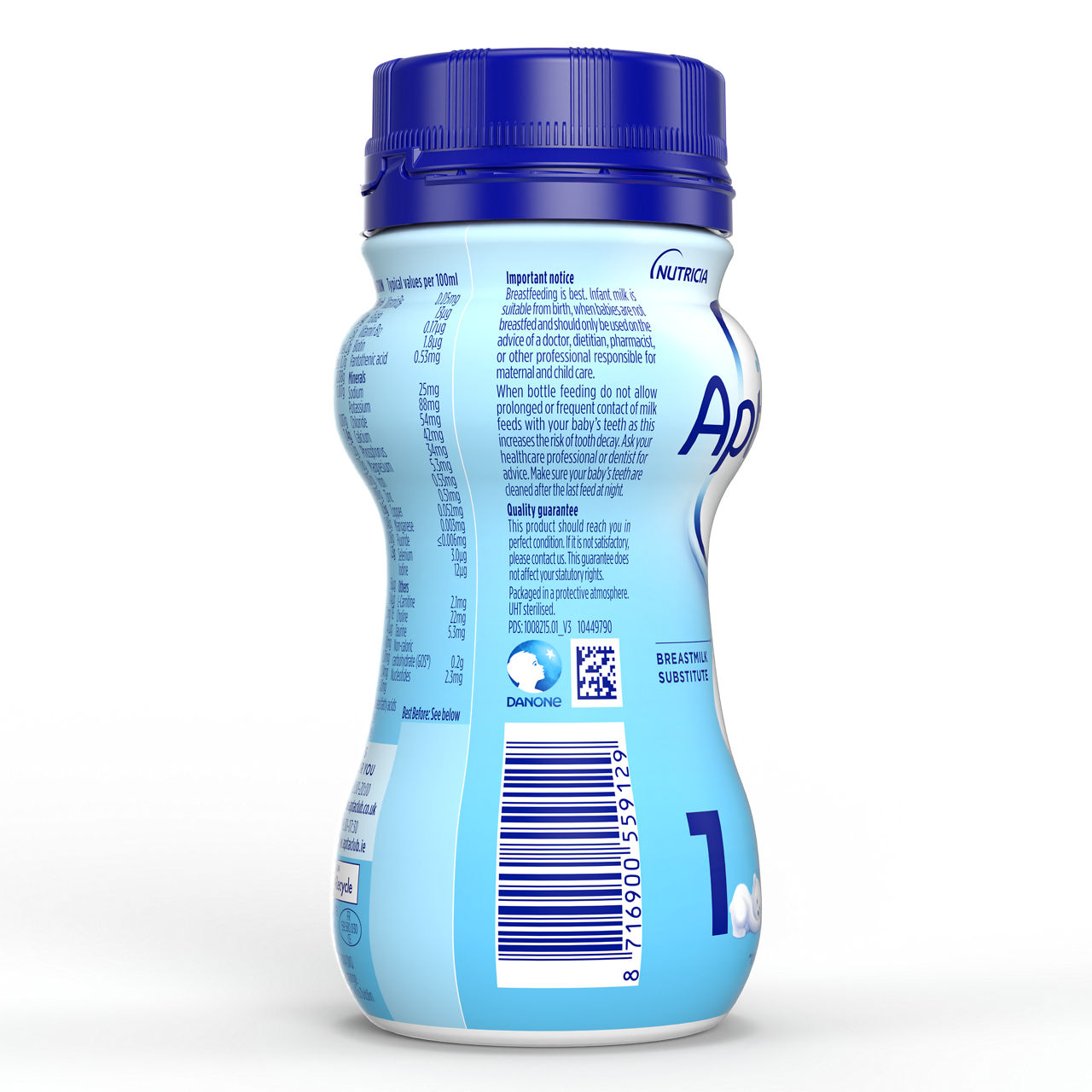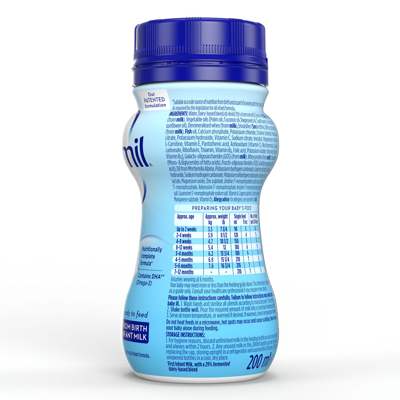 Hranilne vrednosti na 100 ml pripravljenega obroka: energija 276 KJ (66kcal), maščobe 3,4g, od katerih nasičene 1,0g, 1x nenasičene 1,6 g, večkrat nenasičene 0,7g od teh 0,038 g LCP1 od teh arahidonska kislina (AA) 0,017g, dokozaheksaenojska kislina (DHA) 0,017g, ogljikovi hidrati 7,3g od teh, sladkorji 7,2g, od teh laktoza 7,0 g, polioli-inozitol 0,007g, prehranske vlaknine 0,6g, od teh: ²GOS 0,48 g, ³FOS 0,08 g, beljakovine 1,3g, vitamini: vitamin A 58 µg, vitamin D3 1,44 µg, vitamin E 1,3 mg TE, vitamin K1 5,5 µg, vitamin C 9,2 mg, tiamin (B1) 0,07 mg, riboflavin (B2) 0,13 mg, niacin (B3) 0,43 mg, vitamin B6 0,05 mg, folat 14 µg, vitamin B12 0,16 µg, biotin 1,9 µg, pantotenska kislina (B5) 0,53 mg, Minerali: natrij 24 mg, kalij 88 mg, klorid 51 mg, kalcij 48 mg, fosfor 34 mg, magnezij 5,5 mg, železo 0,53 mg, cink 0,48 mg, baker 0,050 mg, mangan 0,003 mg, florid ≤0,006 mg, selen 2,5 µg, jod 13 µg Ostalo: L-karnitin 2,0 mg, holin 22 mg, tavrin 0,07 mg, ogljikovi hidrati brez kalorij 0,2 g.