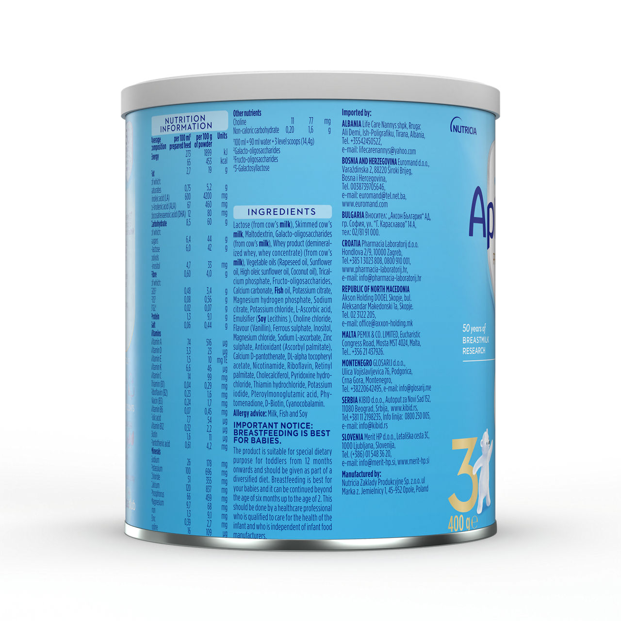 Sestavine: laktoza (iz mleka), posneto mleko v prahu, maltodekstrin, galaktooligosaharidi (iz mleka), sirotka (demineralizirana, koncentrat sirotkinih beljakovin), rastlinska olja (repično, sončnično, ekstra sončnično in kokosovo olje), kalcijev fosfat, fruktooligosaharidi, kalcijev karbonat, ribje olje, kalijev citrat, magnezijev hidrogen fosfat, natrijev citrat, kalijev klorid, L-askorbinska kislina, emulgator:(sojin lecitin), holin klorid, okus (vanilin), železov sulfat, inozitol, magnezijev klorid, natrijev L-askorbat, cinkov sulfat, antioksidant (askorbil palmitat), kalcijev D-pantotenat, DL alfa tokoferil acetat, nikotinamid, riboflavin, retinil palmitat, holekalciferol, piridoksin hidroklorid, tiamin hidroklorid, kalijev jodid, pteroilmonoglutaminska kislina, fitomenadion, D-biotin, cianokobalamin. Alergeni: mleko, ribe in soja.