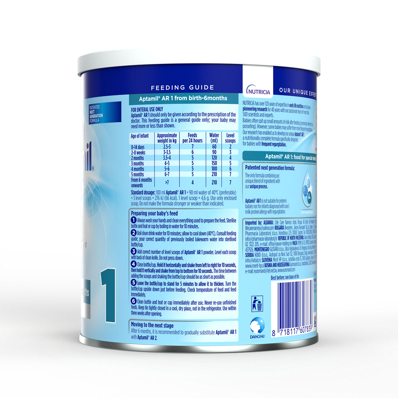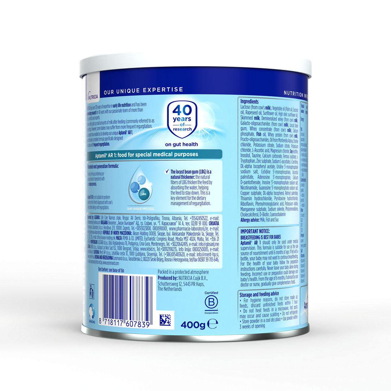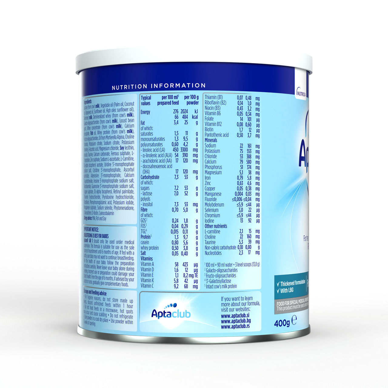 Sestavine: laktoza (iz mleka), rastlinska olja (palmovo, kokosovo, repično, sončnično in ekstra sončnično olje), posneto mleko v prahu, demineralizirana sirotka (iz mleka), galakto-oligosaharidi (iz mleka), gumi iz zrn rožičevca, koncentrat beljakovin sirotke (iz mleka), kalcijev fosfat, ribje olje, beljakovine sirotke (iz mleka), frukto-oligosaharidi, olje iz Mortierella Alpina, holin klorid, kalijev citrat, natrijev citrat, kalijev klorid, L-askorbinska kislina, magnezijev klorid, emulgator: sojin lecitin, inozitol, tavrin, kalcijev karbonat, železov sulfat, L-triptofan, cinkov sulfat, natrijev L-askorbat, L-karnitin, DL-alfa tokoferil acetat, uridin 5’-monofosfat natrijeva sol, citidin 5’-monofosfat, askorbil palmitat, adenozin 5’-monofosfat, kalcijev D-pantotenat, inozin 5’-monofosfat natrijeva sol, nikotinamid, gvanozin 5’-monofosfat natrijeva sol, bakrov sulfat, DL-alfa tokoferol, retinil palmitat, tiamin hidroklorid, piridoksin hidroklorid, riboflavin, pteroilmonoglutaminska kislina, kalijev jodid, manganov sulfat, natrijev selenit, fitomenadion, holekalciferol, D-biotin, cianokobalamin. Alergeni: mleko, ribe, soja.