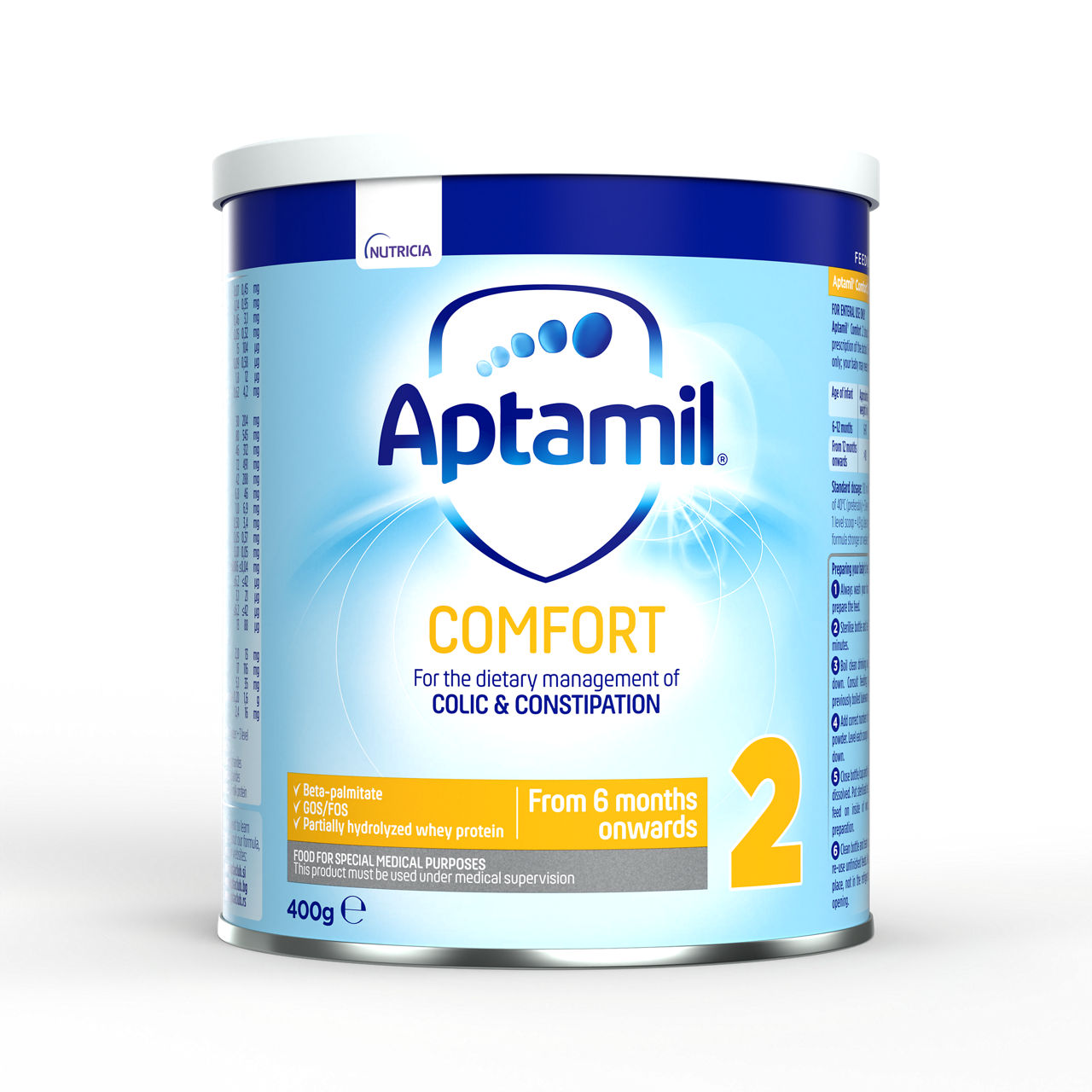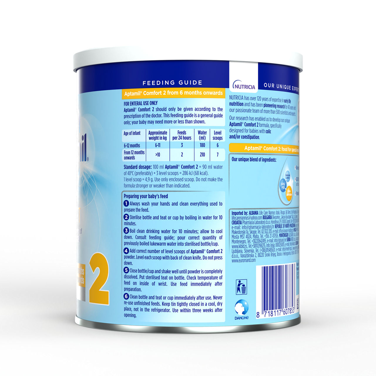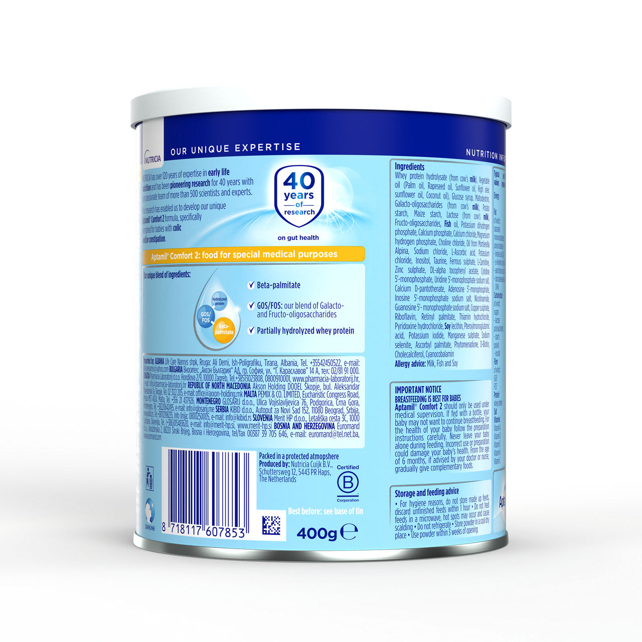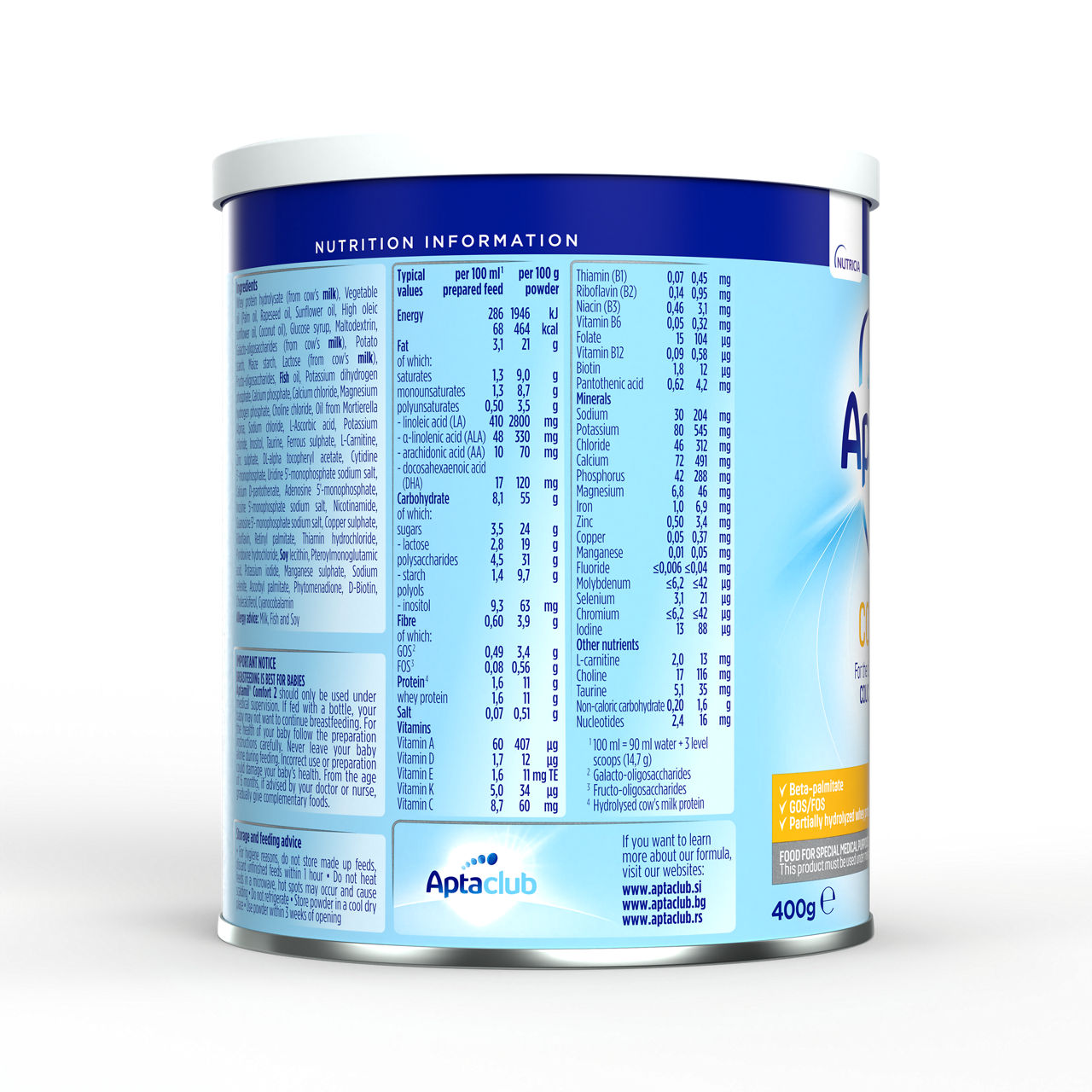 Sestavine: hidrolizat beljakovin sirotke (iz mleka), rastlinska olja (palmovo, repično, sončnično in ekstra sončnično ter kokosovo olje), glukozni sirup, maltodekstrin, galakto-oligosaharidi (iz mleka), krompirjev škrob, koruzni škrob, laktoza (iz mleka), frukto-oligosaharidi, ribje olje, kalijev hidrogen fosfat, kalcijev fosfat, kalcijev klorid, magnezijev hidrogen fosfat, holin klorid, olje iz Mortierella Alpina, natrijev klorid, L-askorbinska kislina, kalijev klorid, inozitol, tavrin, železov sulfat, L-karnitin, cinkov sulfat, DL-alfa tokoferil acetat, citidin 5’-monofosfat, uridin 5’-monofosfat natrijeva sol, kalcijev D-pantotenat, adenozin 5’-monofosfat, inozin 5’-monofosfat natrijeva sol, nikotinamid, gvanozin 5’-monofosfat natrijeva sol, bakrov sulfat, riboflavin, retinil palmitat, tiamin hidroklorid, piridoksin hidroklorid, emulgator: sojin lecitin, pteroilmonoglutaminska kislina, kalijev jodid, manganov sulfat, natrijev selenit, askorbil palmitat, fitomenadion, D-biotin, holekalciferol, cianokobalamin. Alergeni: mleko, ribe, soja.