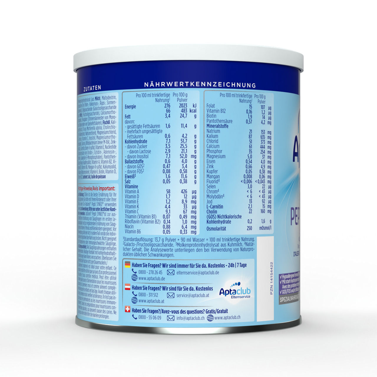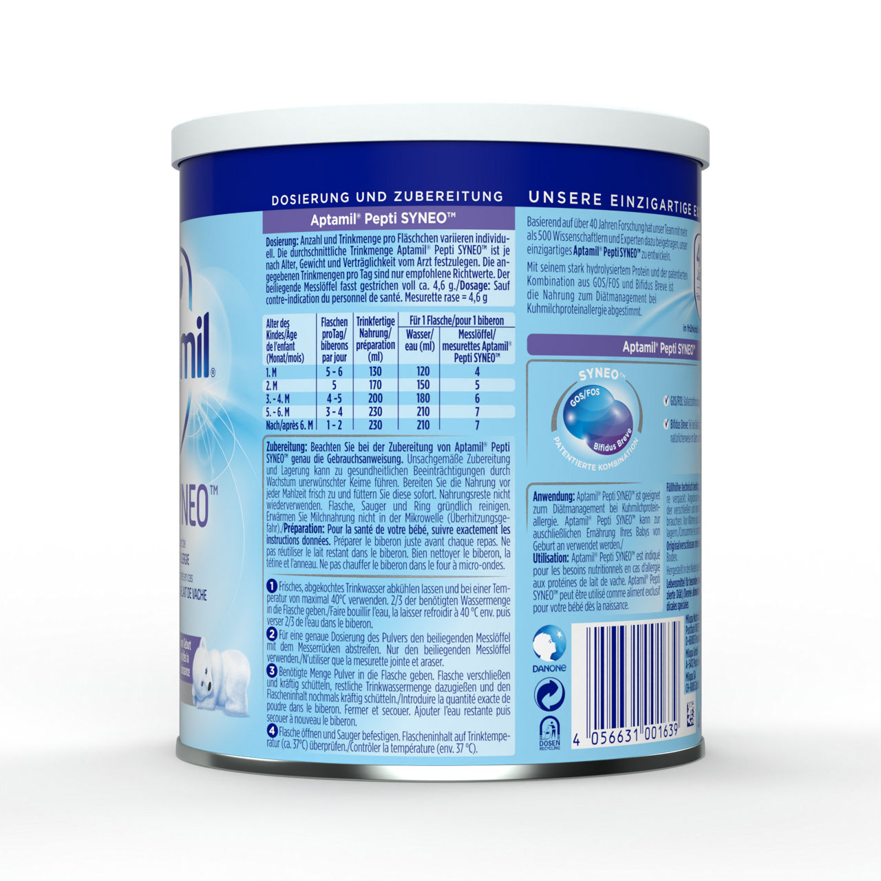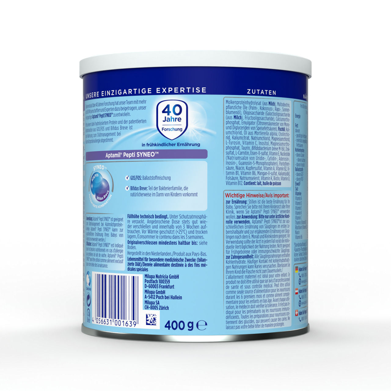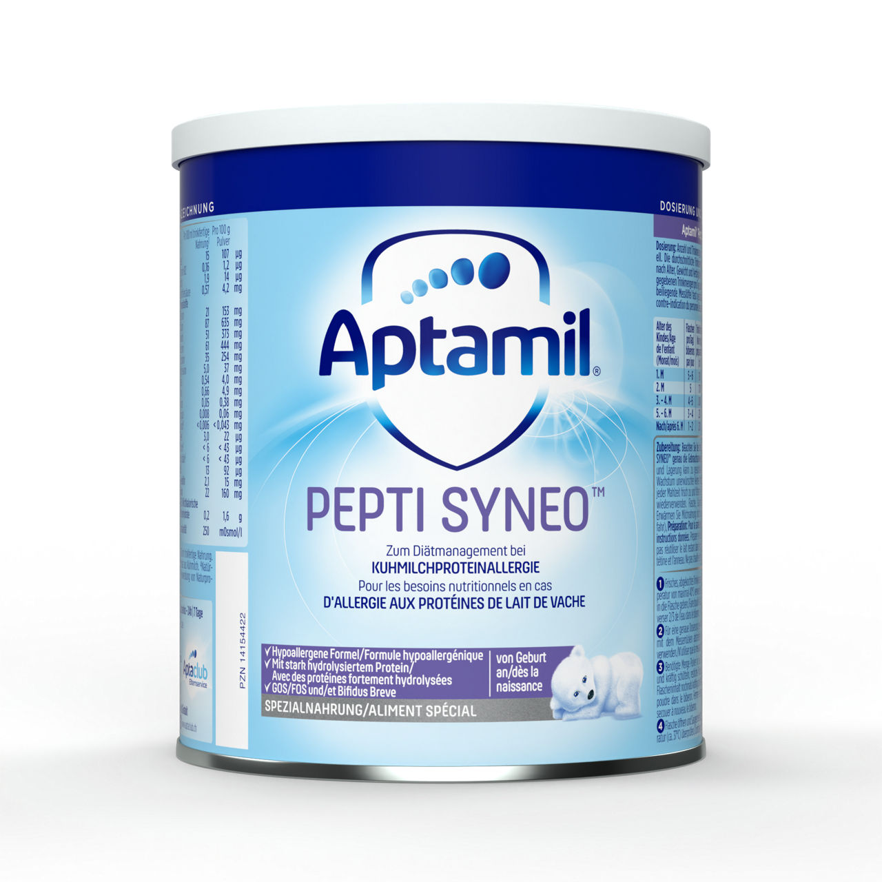Sestavine: hidrolizirane beljakovine sirotke (iz mleka), maltodekstrin, rastlinsko olje (palmovo, kokosovo, repično, sončnično olje), galakto-oligosaharidi (iz mleka), frukto-oligosaharidi, kalcijev fosfat, emulgator (estri citronske kisline z mono in digliceridi maščobnih kislin), ribje olje, kalijev klorid, olje Mortierella Alpina, holin klorid, kalijev citrat, natrijev klorid, magnezijev klorid, L-Tirozin, vitamin C, inozitol, magnezijev fosfat, tavrin, Bifidobacterium breve M-16V, cinkov sulfat, L-karnitin, železov sulfat, vitamin E, nukleotidi (natrijev uridin 5'-monofosfat, natrijev citidin 5'-monofosfat, adenozin 5'-monofosfat, natrijev inozin 5'-monofosfat, natrijev gvanozin 5'-monofosfat), pantotenska kislina, niacin, bakrov sulfat, vitamin A, vitamin B2, vitamin B1, manganov sulfat, kalijev jodid, folna kislina, natrijev selenit, vitamin K, biotin, vitamin D, vitamin B12. Alergeni: mleko in ribe.