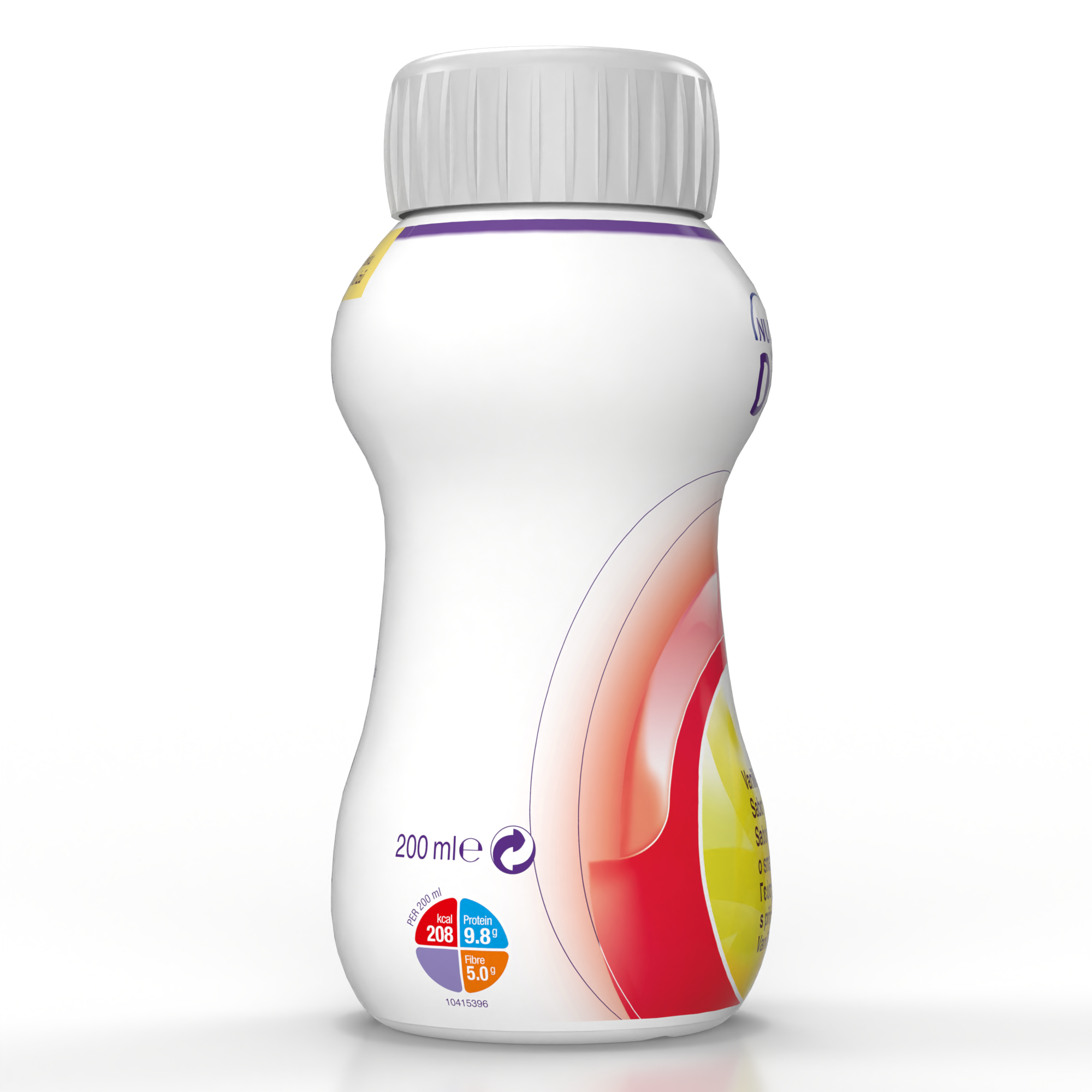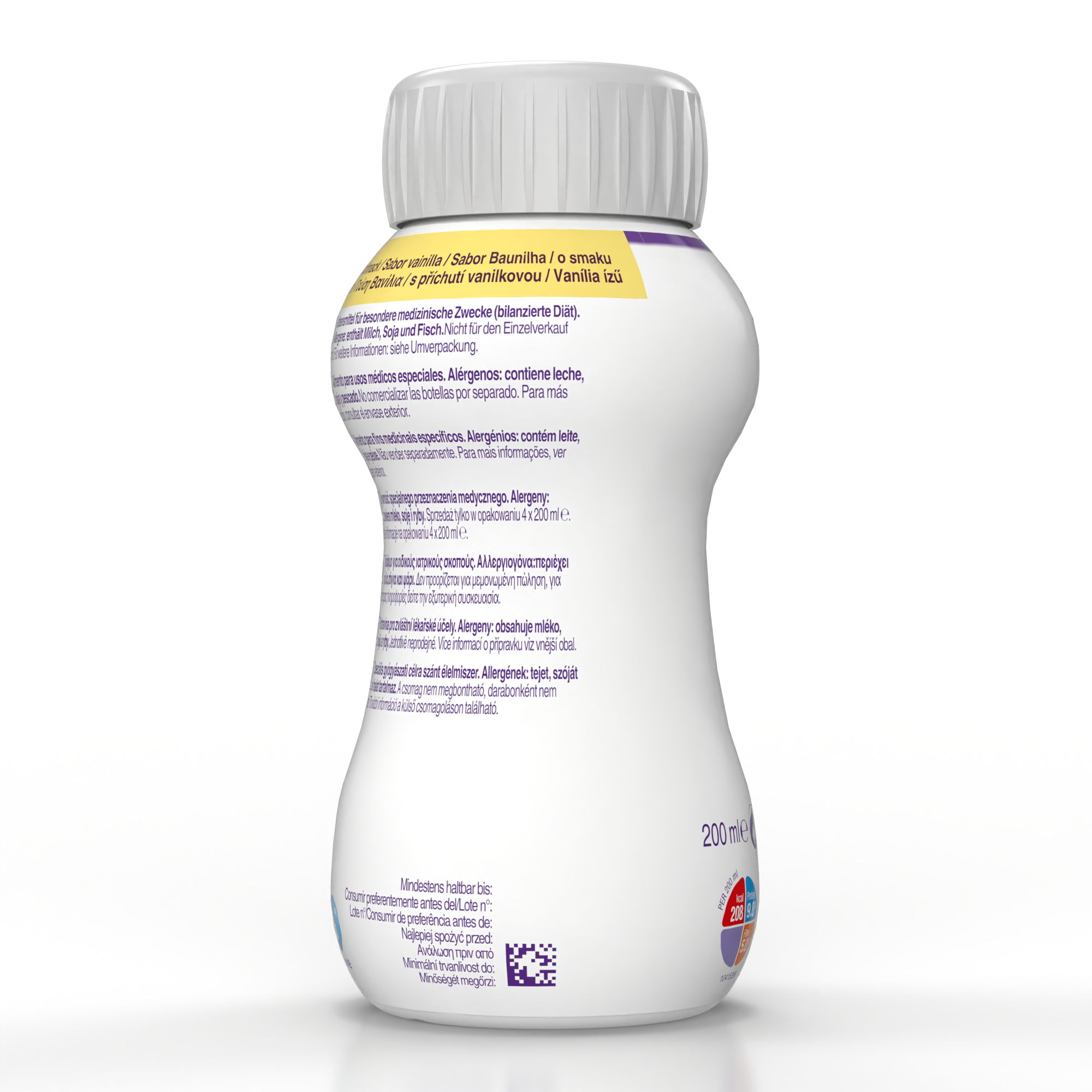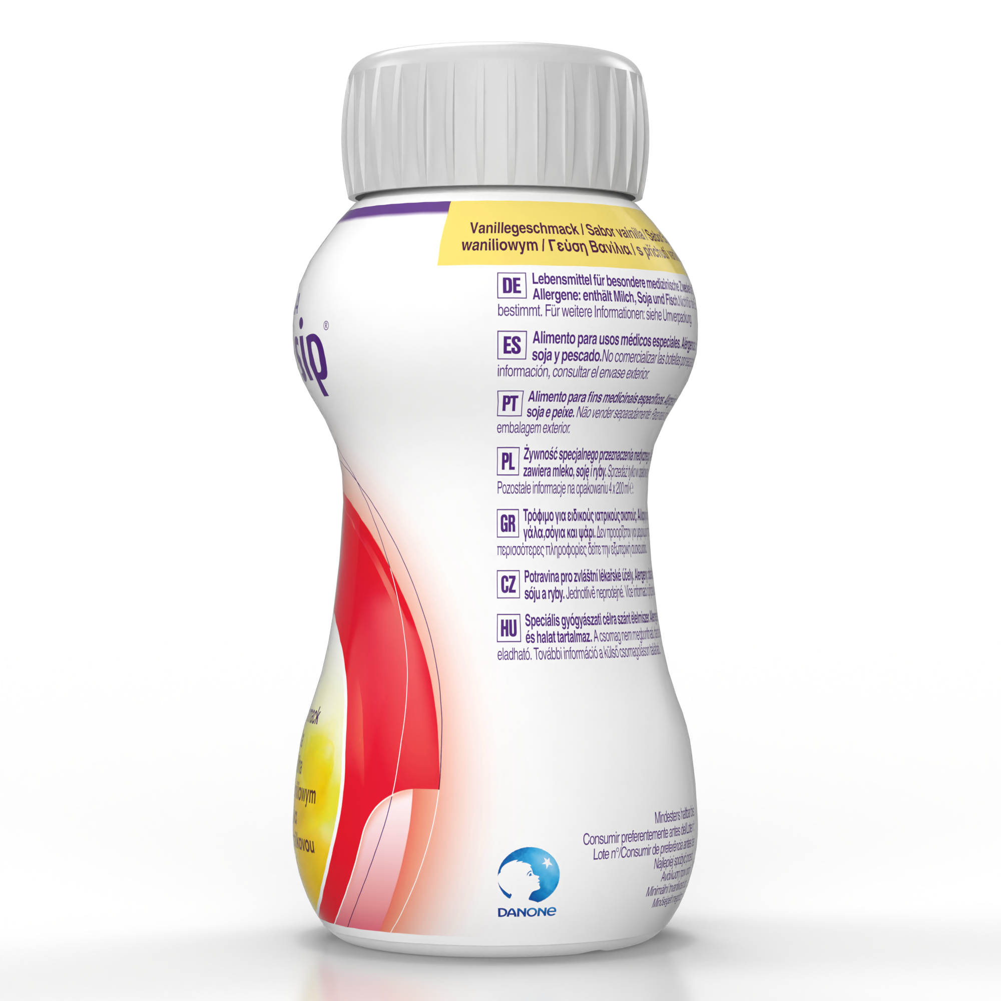 voda, izomaltuloza*, dijetna vlakna (galakto-oligosaharidi (iz kravljeg mleka), rezistentni dekstrin, rezistentni skrob, celuloza), biljna ulja (ulje uljane repice, suncokretovo ulje), tapioka skrob , laktoza (iz kravljeg mleka), koncentrat proteina surutke (iz kravljeg mleka), izolat proteina soje, aroma (vanila), regulator kiselinosti (limunska kiselina), riblje ulje, kalijum-citrat, holin-hlorid, karotenoidi (sadrže soju) (β-karoten, lutein, likopen oleorezina iz paradajza), magnezijum-hidroksid, dikalijum-hidrogenfosfat, kalijum-hidroksid, natrijum-L-askorbat, boja (kurkumin), kalcijum-hlorid, natrijum-citrat, trikalcijum-fosfat, zgušnjivač (karagenin), zaslađivači (acesulfam K, natrijum-saharin), gvožđe(II)laktat, DL-α-tokoferilacetat, kalcijum-karbonat, cink-sulfat, nikotinamid, retinil-acetat, bakar-glukonat, kalcijum-D-pantotenat, hrom-hlorid, mangan-sulfat, natrijum-selenit, D-biotin, tiamin-hidrohlorid, cijanokobalamin, holekalciferol, piridoksin-hidrohlorid, pteroilmonoglutaminska kiselina, riboflavin, natrijum-molibdat, natrijum-fluorid, kalijum-jodid, fitomenadion.