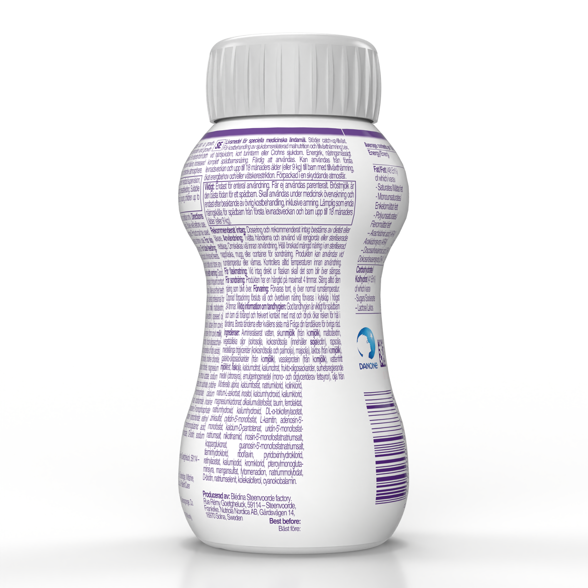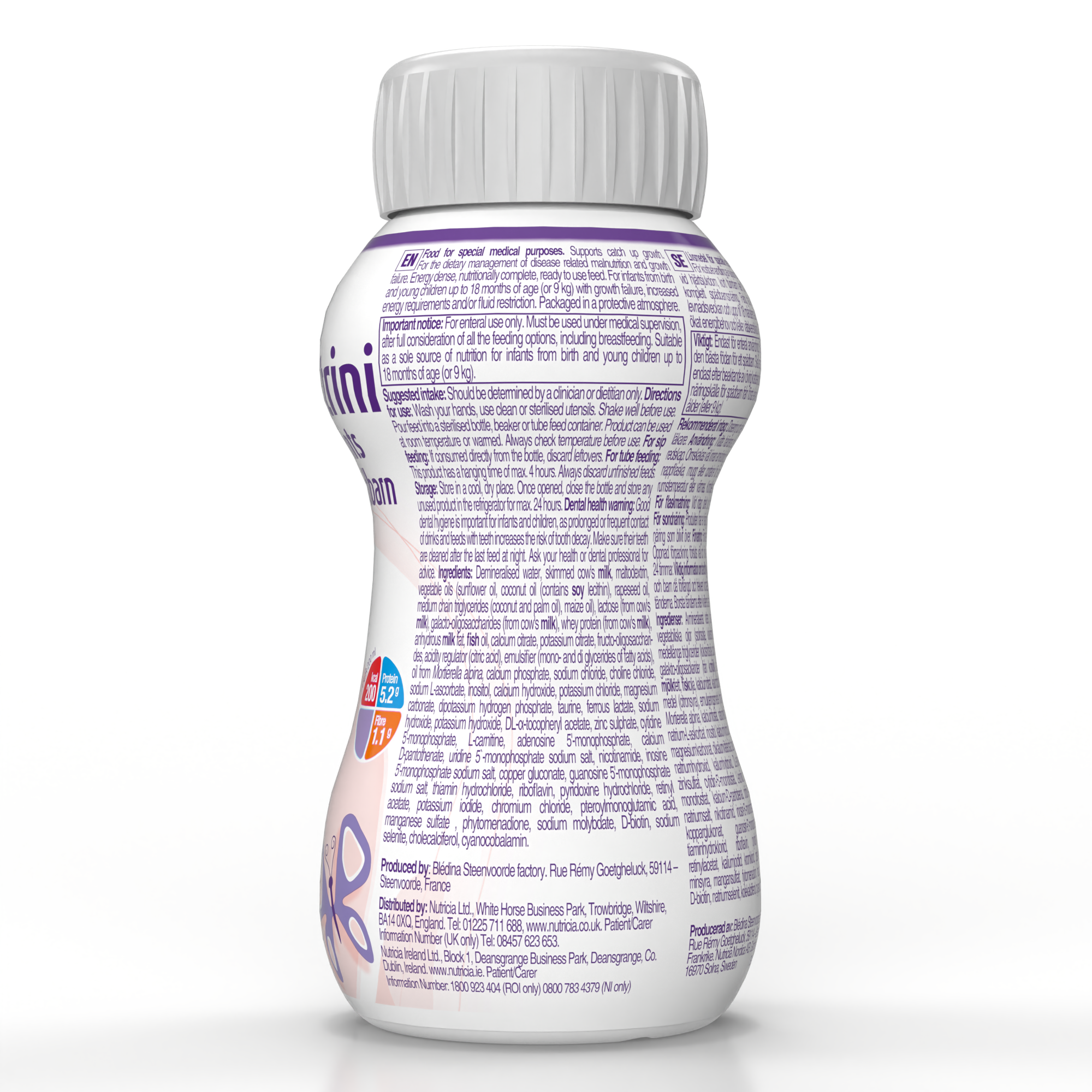 demineralizovana voda, obrano kravlje mleko, maltodekstrin, biljna ulja (suncokretovo ulje, kokosovo ulje (sadrži sojin lecitin), ulje uljane repice, trigliceridi srednje dužine lanca (kokosovo i palmino ulje), kukuruzno ulje), laktoza (iz kravljeg mleka), galakto-oligosaharidi (iz kravljeg mleka), proteini surutke (iz kravljeg mleka), anhidrovane mlečne masti, riblje ulje, trikalcijum-dicitrat, frukto-oligosaharidi, kalijum-citrat, regulator kiselosti (limunska kiselina), emulgator (mono i digliceridi masnih kiselina), ulje iz Mortierella alpina, trikalcijum-fosfat, natrijum-hlorid, holin-hlorid, inositol, L-askorbinska kiselina, kalcijum-hidroksid, kalijum-hlorid, magnezijum-karbonat, kalijum-hidroksid, dikalijum-hidrogen fosfat, taurin, gvožđe(II)-laktat, natrijum–hidroksid, natrijum-L-askorbat, DL-α-tokoferil acetat, cink-sulfat, citidin 5'-monofosfat, L-karnitin, adenozin 5'-monofosfat, kalcijum-D-pantotenat, uridin 5'-monofosfat dinatrijum so, nikotinamid, inozin-5'-monofosfat dinatrijum so, bakar-glukonat, guanozin-5'-monofosfat dinatrijum so, tiamin-hidrohlorid, riboflavin, piridoksin-hidrohlorid, retinil-acetat, kalijum-jodid, hrom-hlorid, pteroilmonoglutaminska kiselina, mangan-sulfat, fitomenadion, natrijum-molibdat, D-biotin, natrijum-selenit, holekalciferol, cijanokobolamin.