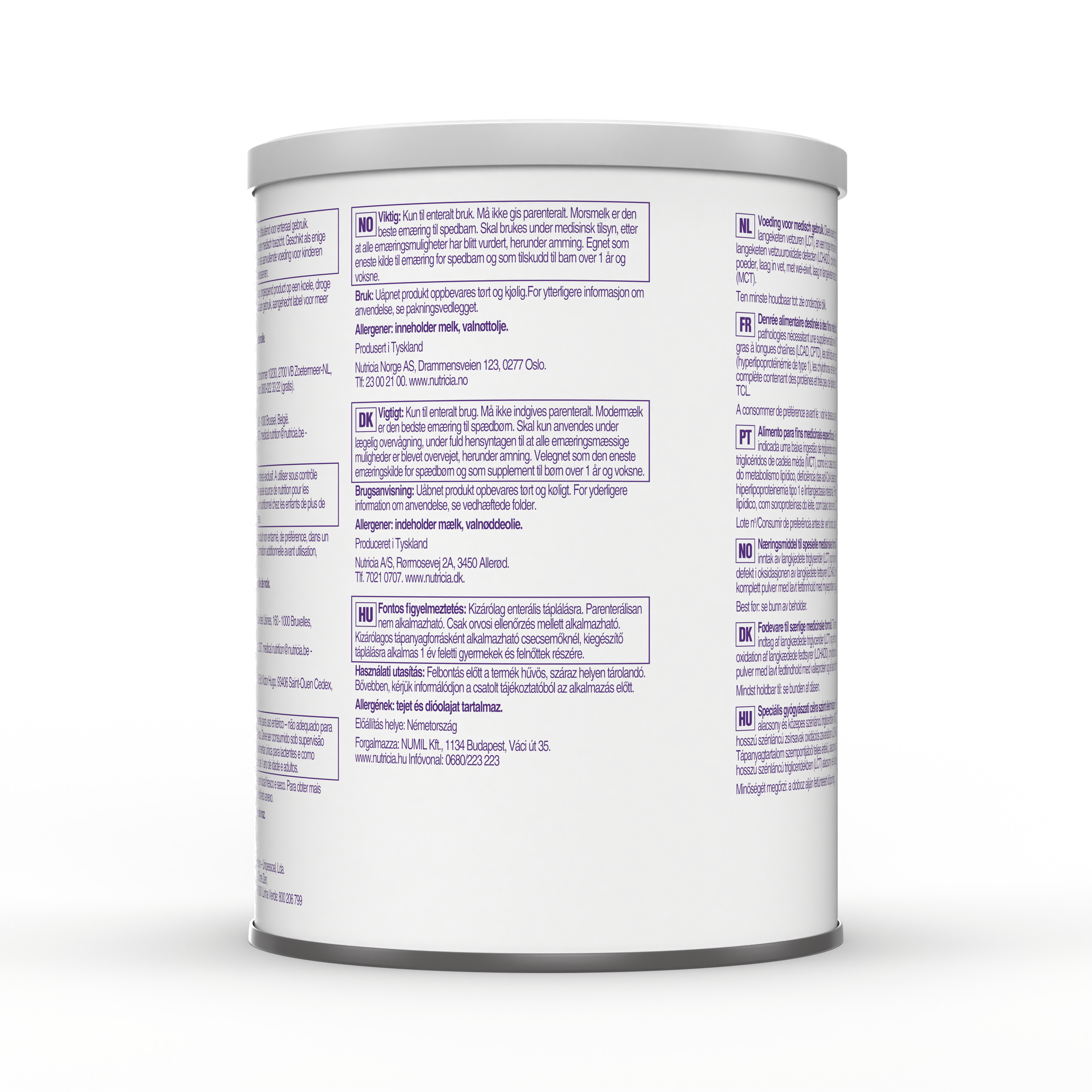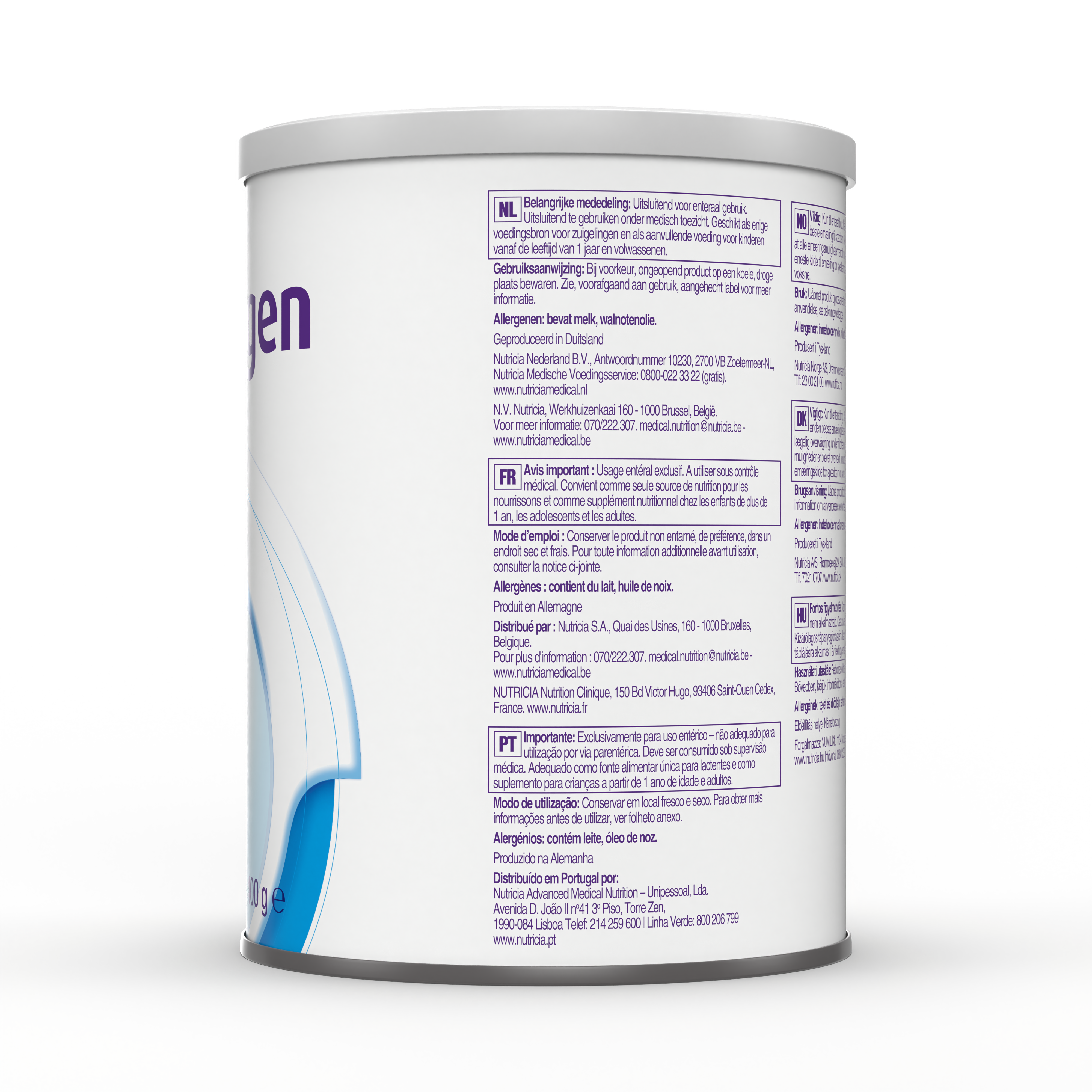 Maltodextrin, skimmed cow's milk , refined vegetable oils (medium-chain triglycerides (coconut and/or palm oil), walnut oil , sunflower oil), whey protein (from cow's milk ), calcium caseinate (from cow's milk ), sodium citrate, glucose syrup, potassium chloride, calcium carbonate, magnesium hydrogen phosphate, Crypthecodinium cohnii oil, choline chloride, Mortierella alpina oil L-valine, inositol, L-ascorbic acid, L-tryptophan, sodium L-ascorbate, taurine, iron(II) sulfate, zinc sulfate, L-carnitine, DL-α-tocopheryl acetate, nicotinamide, DL-α-tocopherol, calcium D-pantothenate, copper(II) sulfate, pyridoxine hydrochloride, retinyl acetate, thiamine hydrochloride, riboflavin, pteroylmonoglutamic acid, potassium iodide, manganese(II) sulfate, chromium(III) chloride, sodium molybdate, phytomenadione, D-biotin, sodium selenite, cholecalciferol.