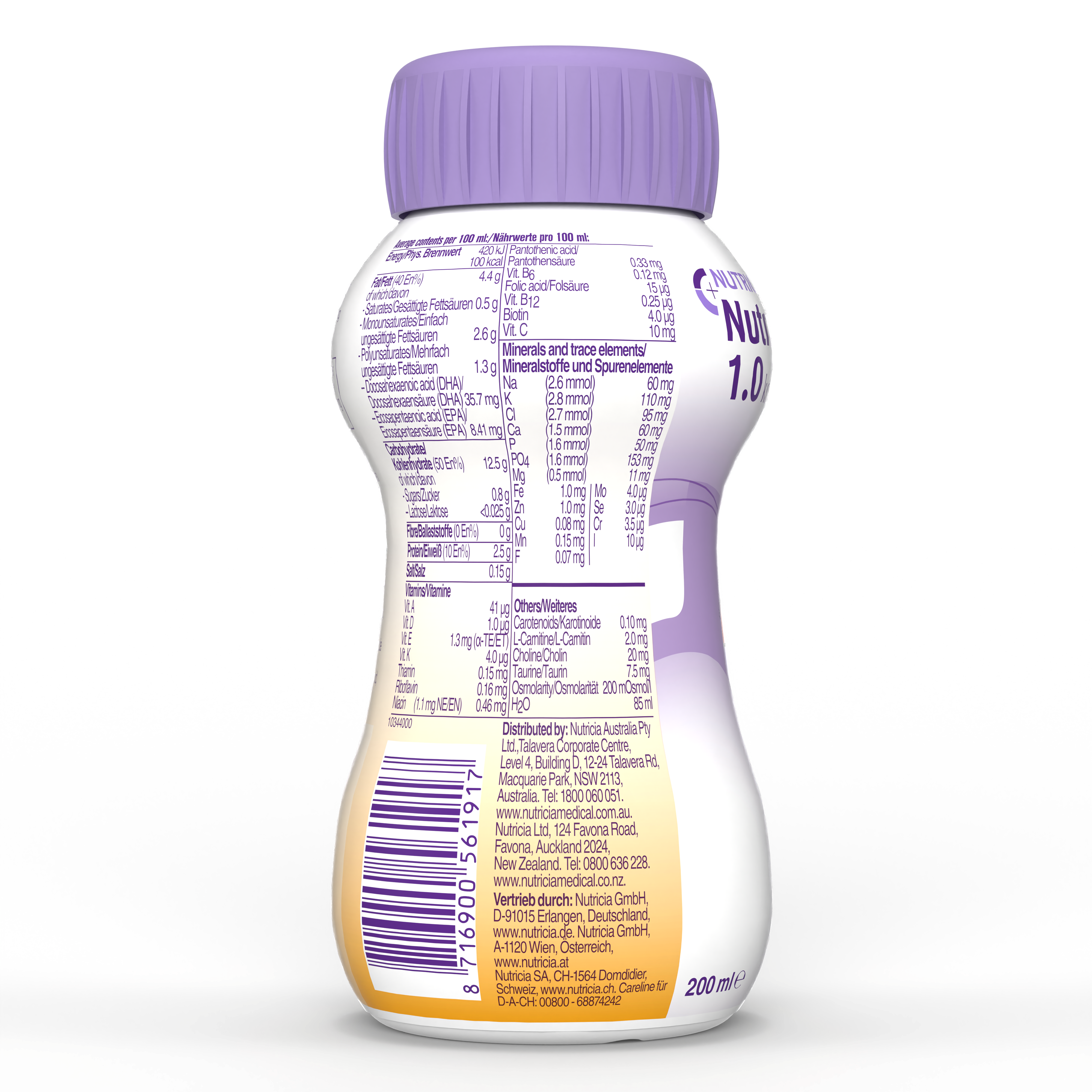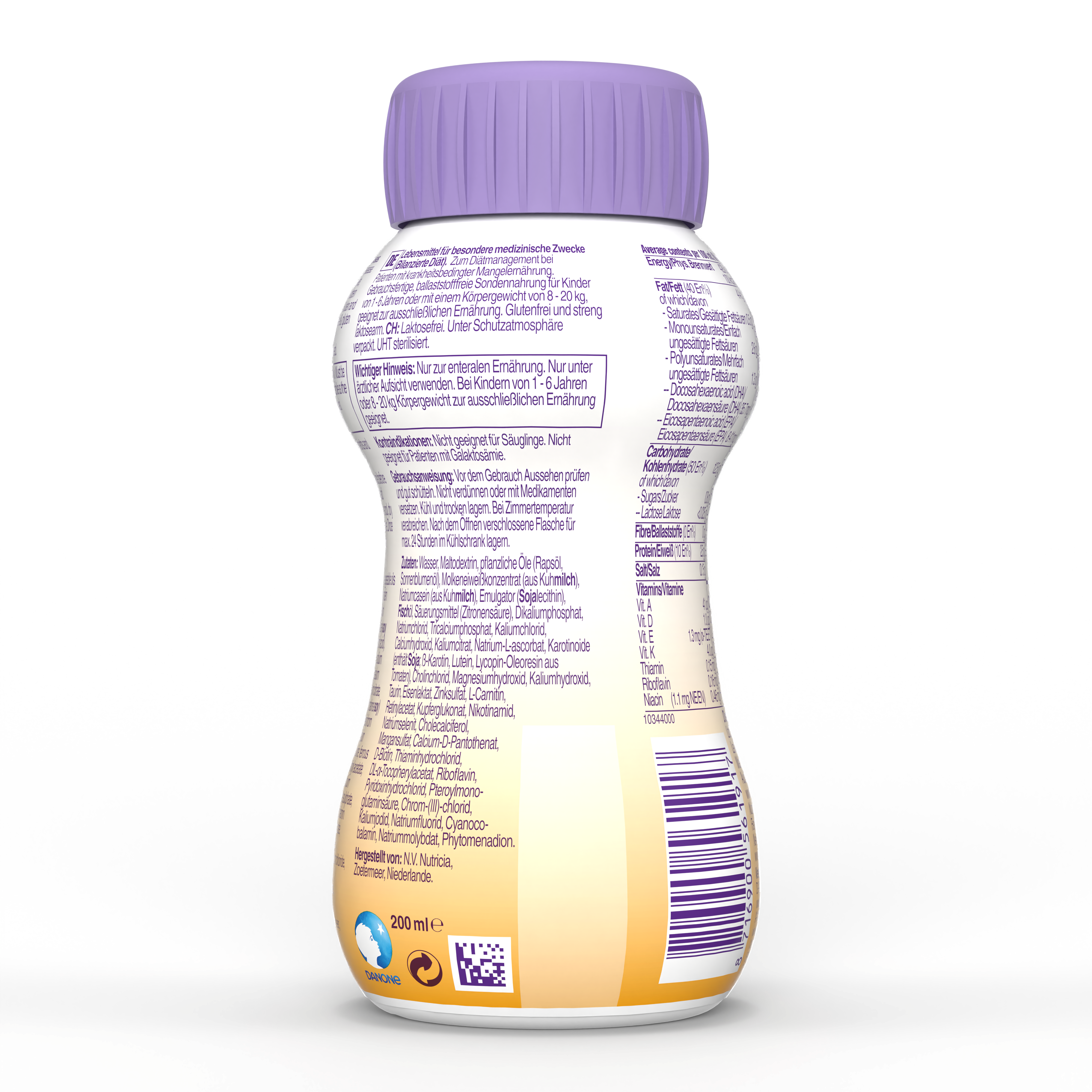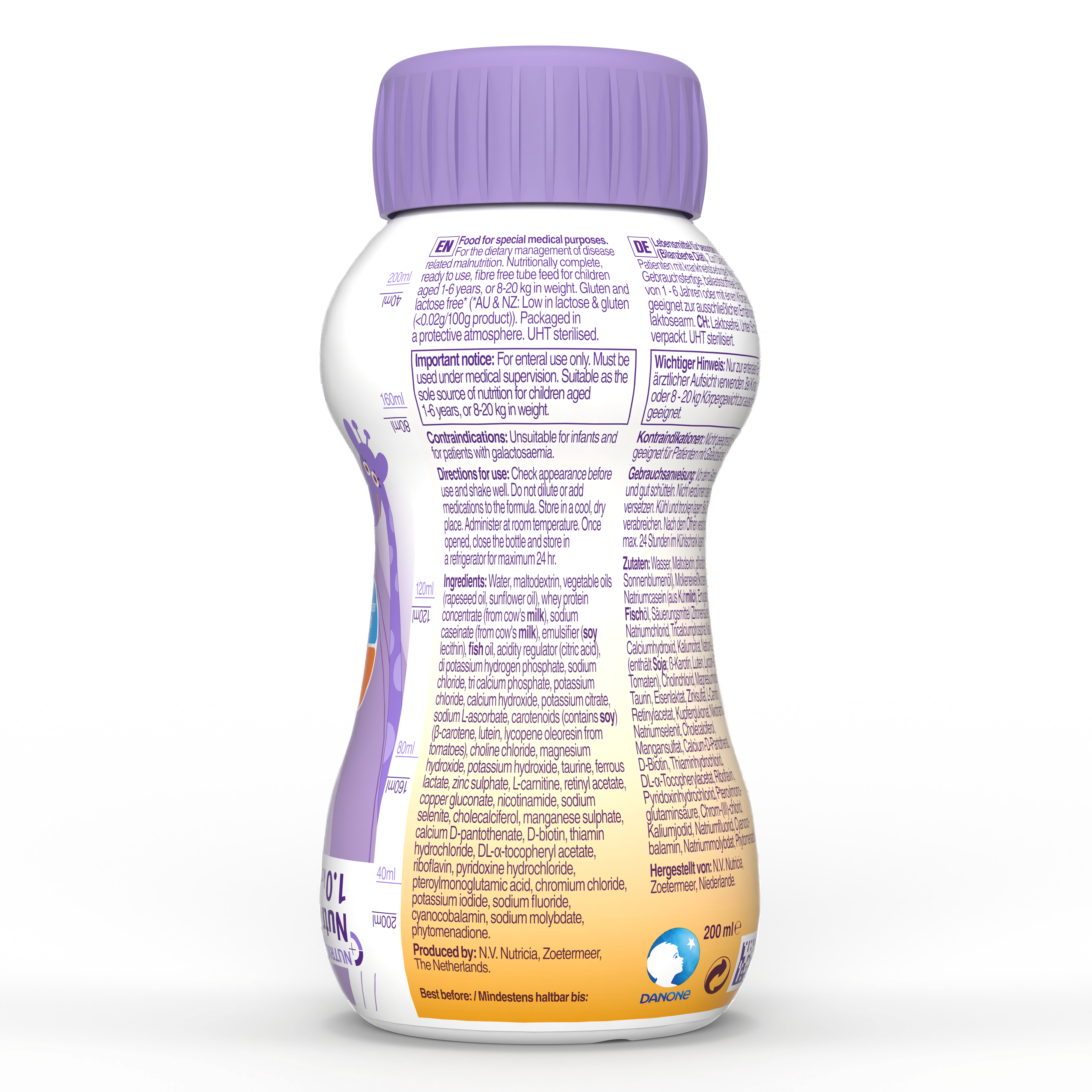 Voda, maltodekstrin, biljna ulja, koncentrat proteina surutke (iz mleka), natrijum-kazeinat (iz mleka), emulgator (lecitin soje), riblje ulje, limunska kiselina, dikalijum-hidrogenfosfat, natrijum-hlorid, trikalcijum-fosfat, kalijum-hlorid, kalcijum-hidroksid, trikalijum-citrat, natrijum-L-askorbat, holin-hlorid, karotenoidi (ß-karoten, lutein, likopen), magnezijum-hidroksid, kalijum-hidroksid, taurin, gvožđe(II)-laktat, cink-sulfat, L-karnitin, nikotinamid, DL-α-tokoferilacetat, retinilacetat, bakar(II)-glukonat, natrijum-selenit, holekalciferol, mangan-sulfat, D-biotin, kalcijum-D-pantotenat, tiamin-hidrohlorid, hrom-hlorid, riboflavin, piridoksin-hidrohlorid, pteroilmonoglutaminska kiselina, kalijum-jodid, natrijum-fluorid, natrijum-molibdat, fitomenadion, cijanokobalamin.